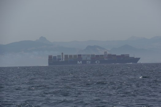 Le matin du 3 août nous quittons Barbate au moteur avec une météo favorable. A l’approche du détroit, une légère brise se met à souffler. Toujours prudents, nous décidons de ne pas hisser la grand voile et de naviguer uniquement sous génois, une première ! Et à midi alors que nous nous engageons dans le détroit…tout se passe merveilleusement bien, pas de grosses vagues, pas de rafales, pas de pannes pour nous faire péter « l’emmerdomètre », bref le rêve.