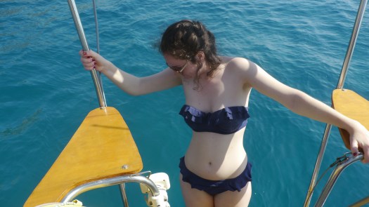 Laurence, la plus courageuse, se trempe, fait quelques mouvements de brasse et revient aussitôt. Quant à Laura et moi nous nous abstenons… Nager avec les méduses très peu pour nous.