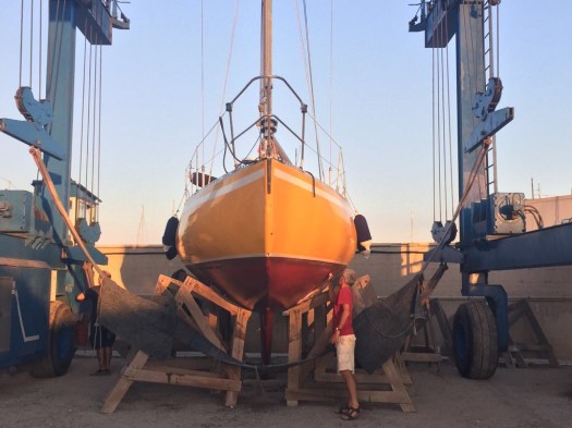 Pliage des voiles, du taux, rinçage du moteur, de l’annexe, du pont, lavage des draps, « vidage » de la glacière, rangement des pare-battages, des bouts, des coffres, amarrage des drisses (en même temps que je vous écris j’en profite pour faire ma Check list…), et voilà Omer et tout son saint-frusquin prêts à hiverner sur ses bers !