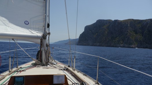 Une petite cala (anse en espagnol) dans laquelle nous sommes mouillés. Devant nous des montagnes très hautes, spectaculaires, autour de nous une eau turquoise transparente, au dessus de nous un ciel bleu, au milieu du ciel bleu le soleil tous feux allumés, derrière nous la mer jusqu’à l’infini. Mais car il y a toujours un mais, où sont passés les nuages ? Réponse : Ecrasés par le soleil, ils paressent ailleurs.