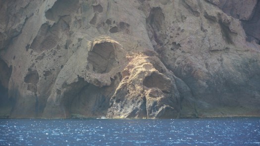Taillées par le vent, sculptées par la mer, érodées par le sel, façonnées par les vagues, polies par les marées, de gigantesques créatures de pierre surgissent de toutes parts comme autant de monstres dans la caverne d’un train fantôme. Ici la figure menaçante d’un monstre marin aux dents acérés semble guetter sa proie, là un gigantesque mammouth paraît sur le point de plonger dans l’eau, plus haut sur une falaise une main à trois doigts semble dévaler la pente tandis qu’un visage percé de trois trous à la place des yeux et de la bouche pousse un cri d’effroi comme celui du célèbre tableau de Munch.