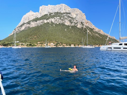 Lorsque Laura arrive, nous décidons de l’emmener à la Tavolara où nous sommes allés quelques jours auparavant. Cette île majestueuse est vraiment impressionnante de hauteur et y mouiller, tout juste à ses pieds, est une expérience vraiment unique.
