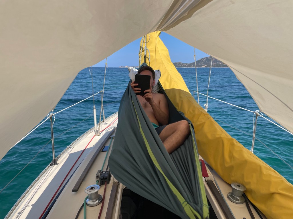 Et en effet pendant ce petit intermède à bord il va comme il le dira lui-même cocher toutes les cases : baignade, bronzage, sieste dans son hamac, lecture, apéritifs et couchers de soleil grandioses.