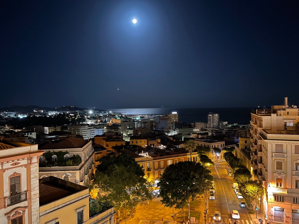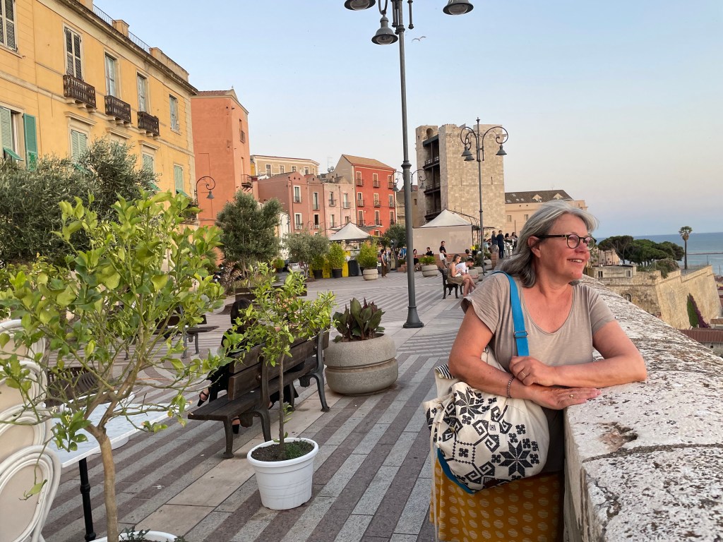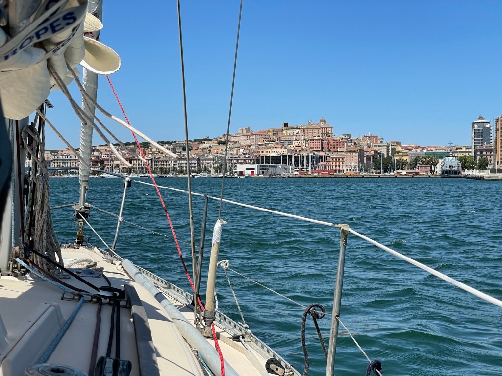 Nous faisons escale à Cagliari dans une marina très chic et très chère, marchons dans les ruelles sombres et austères de la partie moyenâgeuse de la ville, tentons une visite au musée d’archéologie mais zut c’est ballot, il est fermé pour travaux, faisons un peu de lèche-vitrine dans une rue piétonne où un violoniste inspiré joue le canon de Pachelbel, retournons au bateau faire une petite sieste, buvons de délicieux Spritz à la terrasse d’un bar fréquenté par des étudiants bruyants, dînons dans un restaurant en haut des remparts de la ville avec vue imprenable sur la magnifique baie de Cagliari et après deux jours à ce rythme effréné mettons le cap sur Nora.