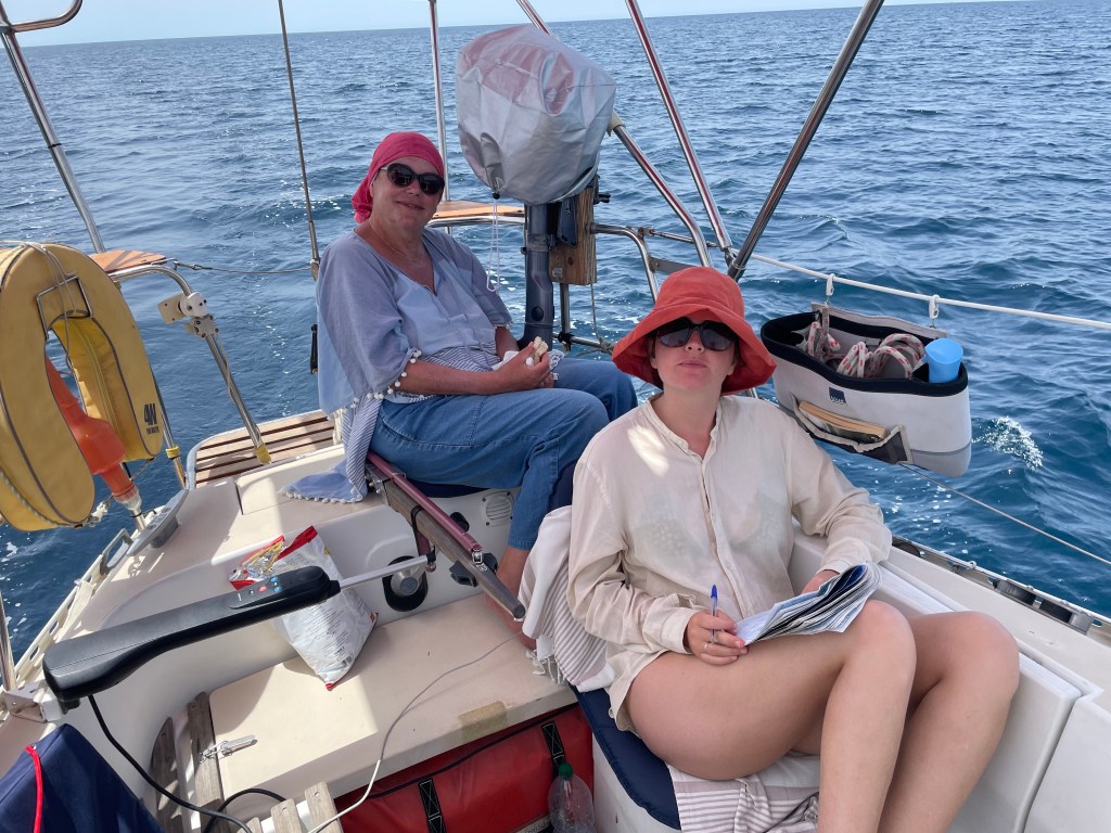 Nous avons le vent face à nous et sommes obligés de tirer des bords. Omer étant un bateau conçu pour remonter au prés, cette allure en principe ne nous déplaît pas mais car il y a toujours un mais car il y a toujours un mais, Laura qui n’est pas encore amarinée a le mal de mer.
