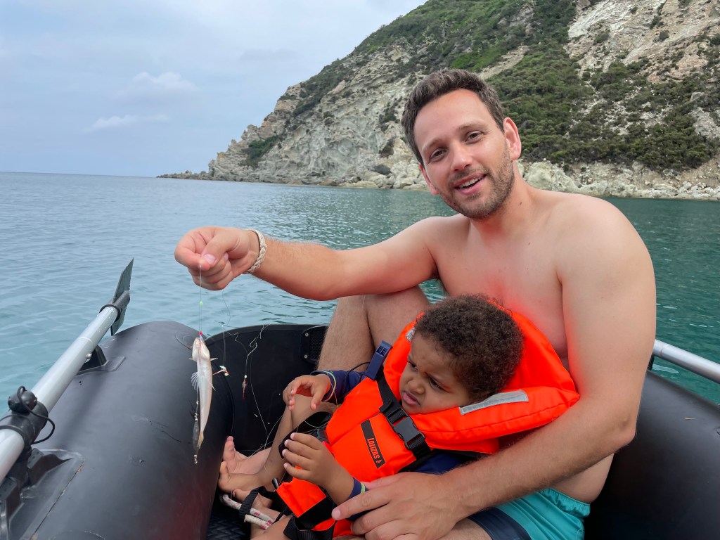 Adrien qui a toujours à coeur de lui faire découvrir de nouvelles choses lui propose d’aller pêcher. Noah n’a pas l’air très enthousiasmé par cette idée mais Adrien dont la pêche est l’activité préférée insiste. Il gonfle l’annexe, lui prépare un fil à pêche, l’installe à bord et nous voilà partis tous les trois dans notre dingi préféré. Nous nous approchons du rivage, coupons le moteur et nous laissons porter par les vagues.