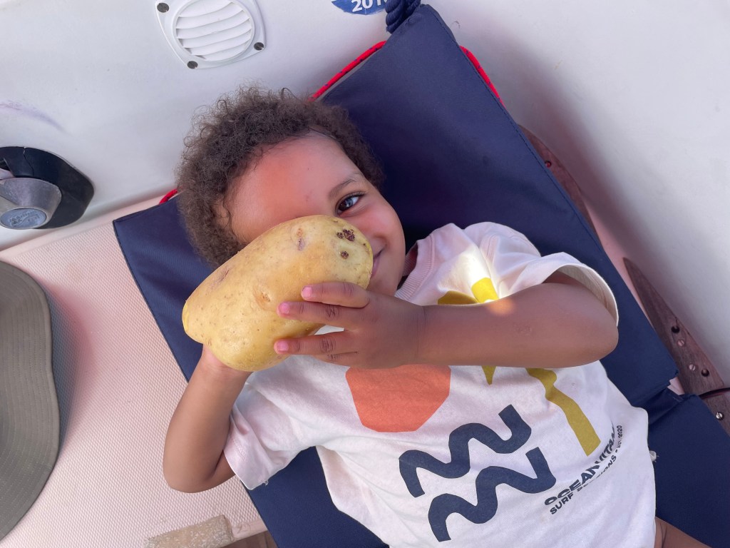 Dans la petite épicerie où nous achetons notre ravitaillement, Noah explique à la vendeuse qu’il adore le poisson, les pommes de terre avec du beurre et du citron. La vendeuse qui comprend le français est tout attendrie par son petit discours et lui offre alors une énorme pomme de terre qui ne le quittera plus de tout le séjour.