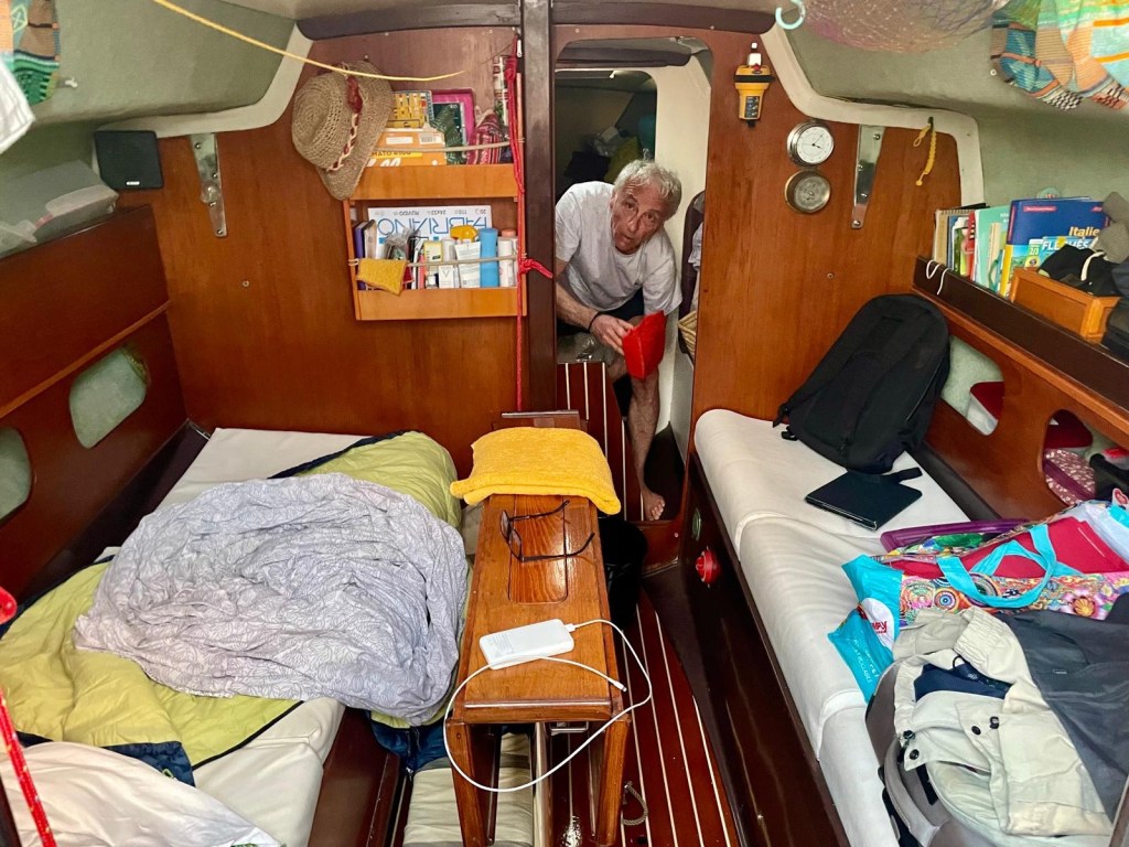 Sébastien qui dormait sur une couchette du carré et qui est toujours prompte à balancer une vanne (d’eau…)