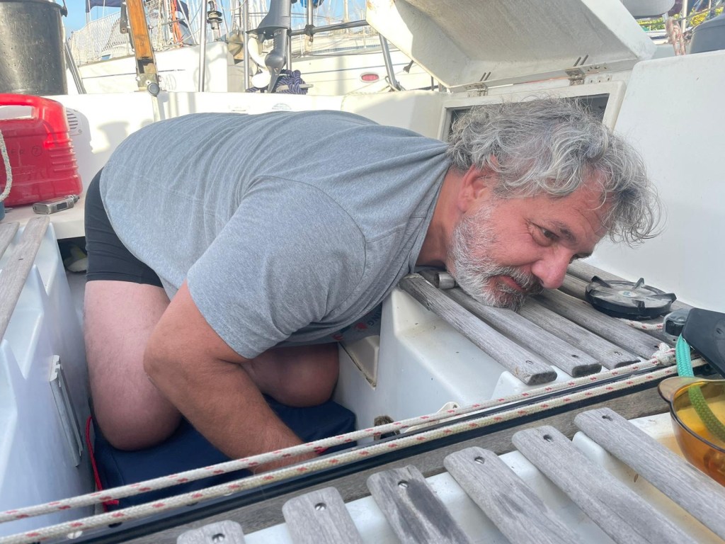 Nous sommes entrain d’embarquer les courses que nous venons de faire lorsque mon regard est attiré par un détail anormal dans le bateau.