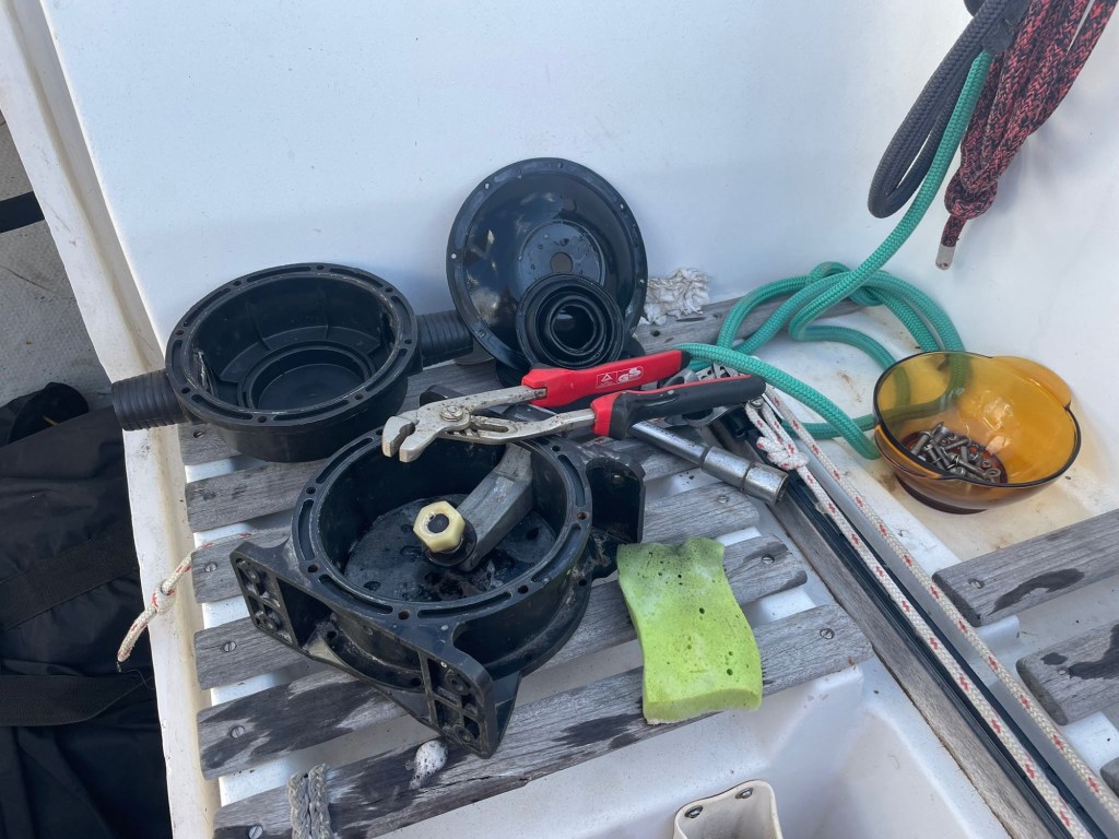 Nous avons passé la journée à errer dans Fiumicino à la recherche d’une pompe à eau douce, d’une pompe de cale et d’une pompe à main plus les raccords, les tuyaux au bon diamètre, les joints etc.