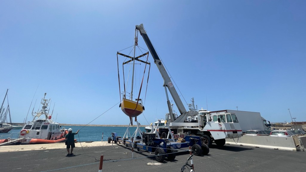 Le hic c’est que la girouette et le réflecteur radar ont été arrachés, les feux de mât ne marchent pas, un taquet du mât a été cassé, les haubans sont totalement désserés et visiblement la baume a été démontée.