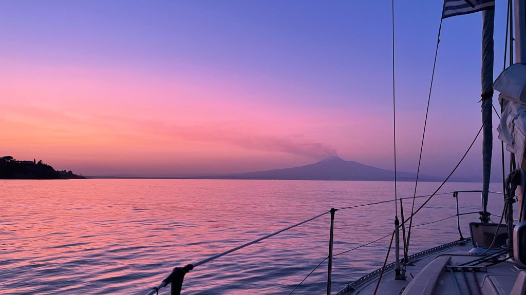 Après Syracuse nous avons vogué vers Catane où un grand blanc avec une veste de quart sur le dos et un sac marin à l’épaule nous a rejoint. Lui aussi a un prénom : Benoit, une nationalité, breton, un métier en voie de disparition : médecin de campagne et un statut familial : beau-frère. Lui aussi parle un excellent français mais avec un accent breton à couper au couteau. S’il ne risque pas le licenciement économique, il risque de mettre la clé sous la porte tant l’administration lui met des bâtons dans les roues et lui court sur le haricot… Lui aussi est très gentil, est arrivé avec plein de cadeaux et surtout avec son éternelle bonne humeur tendue comme un carré de ciel bleu au dessus de la tête.