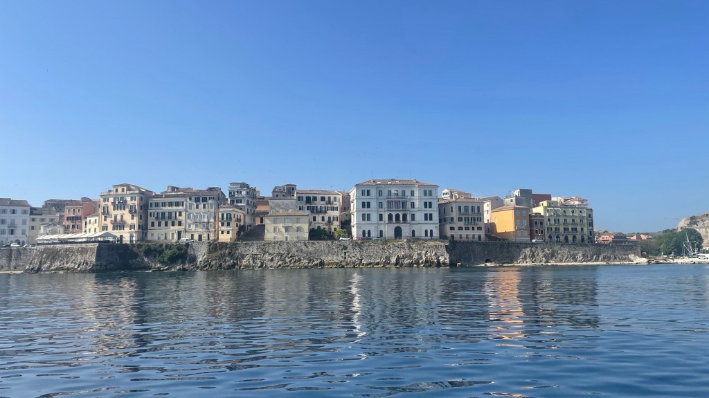 Et c’est sur une mer d’huile, dans une ambiance nimbée de bleue que commencent à percer de rose les premiers rayons du soleil que nous découvrons la magnifique île de Corfou