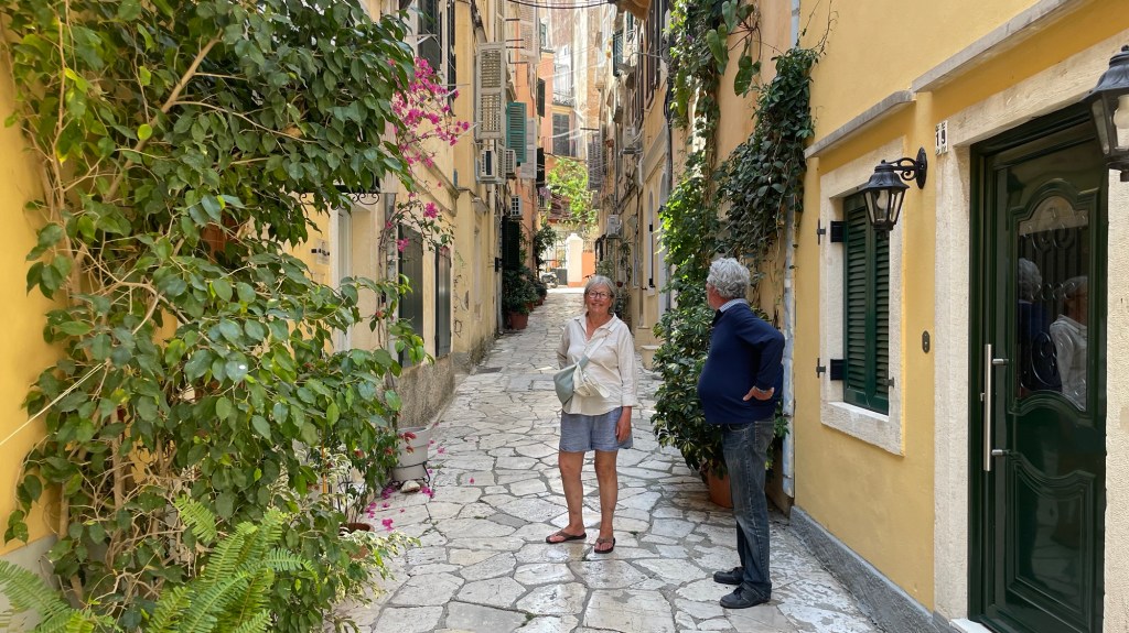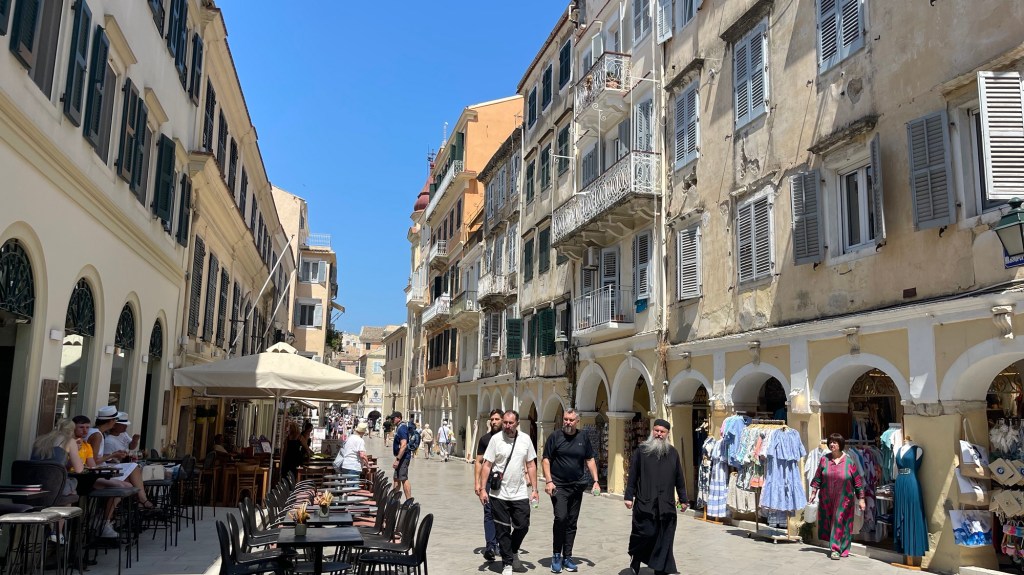Après une douche bien méritée et nécessaire, trois jours de navigation sans se laver…, nous voici dans un taxi en direction de la ville de Corfou. Le taxi, un sympathique bonhomme qui parle anglais nous dépose sur une place et nous montre une artère menant à la vieille ville.