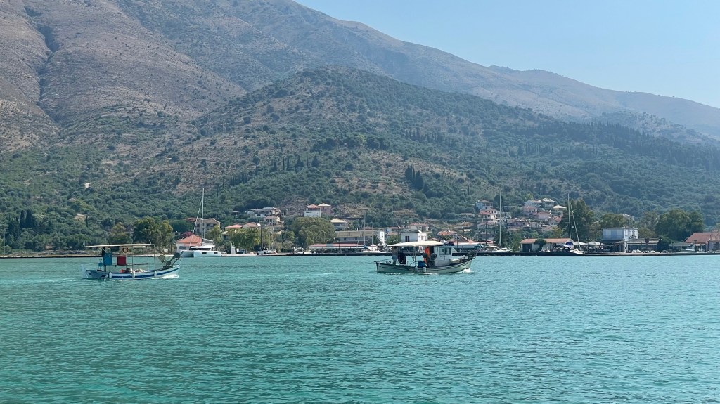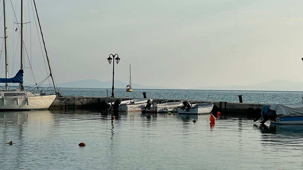 Au loin la silhouette de l’île de Corfou disparaissait peu à peu en contre-jour tandis que la surface de la mer miroitait de mille éclats de rose argenté et que les bateaux autour de nous devenaient des ombres. Aucun bruit hormis le clapotis des vagues contre les coques ne venait troubler la quiétude de cet instant.