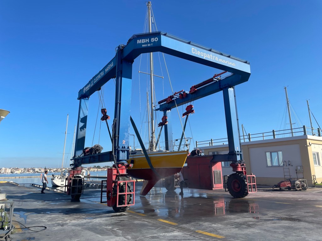 Le lendemain matin à huit trente pétantes nous recevons un appel de la capitainerie nous demandant de nous présenter devant le Travel Lift et en moins d’une demi heure, Omer est hissé sur un chariot, emmené à sa place et calé sur ses bers.