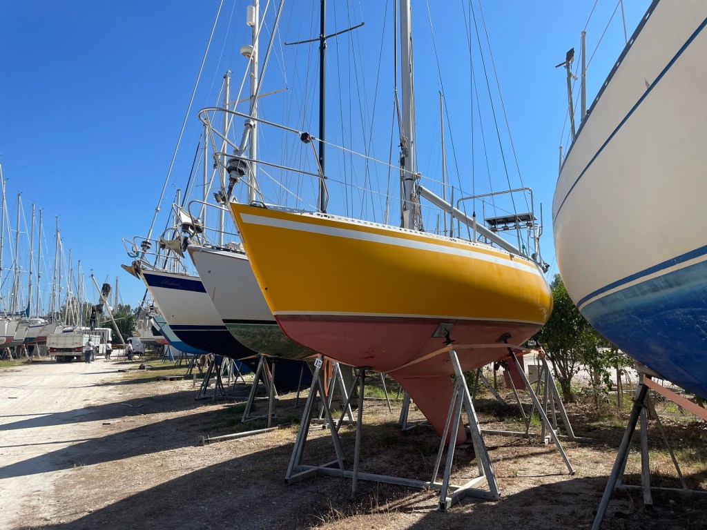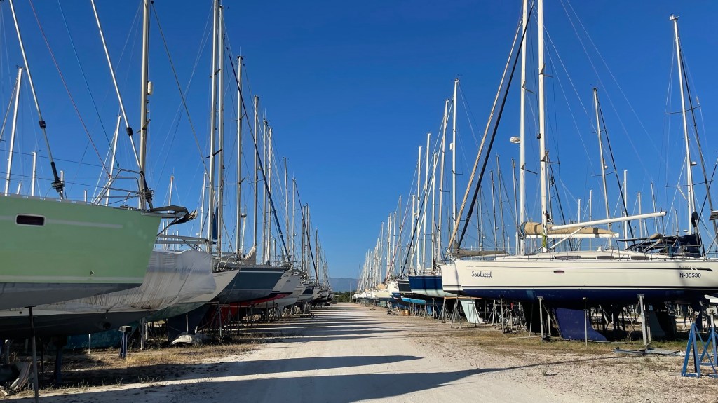 En huit ans d’hivernage, nous n’avons jamais vu une telle efficacité mais est-ce l’immensité de ce terre-plein poussiéreux et brûlé par la chaleur ou la vue de ces centaines de bateaux anonymes alignés les uns à côté des autres, pour la première fois nous quittons notre cher petit voilier avec la douloureuse impression de l’abandonner à son triste sort.