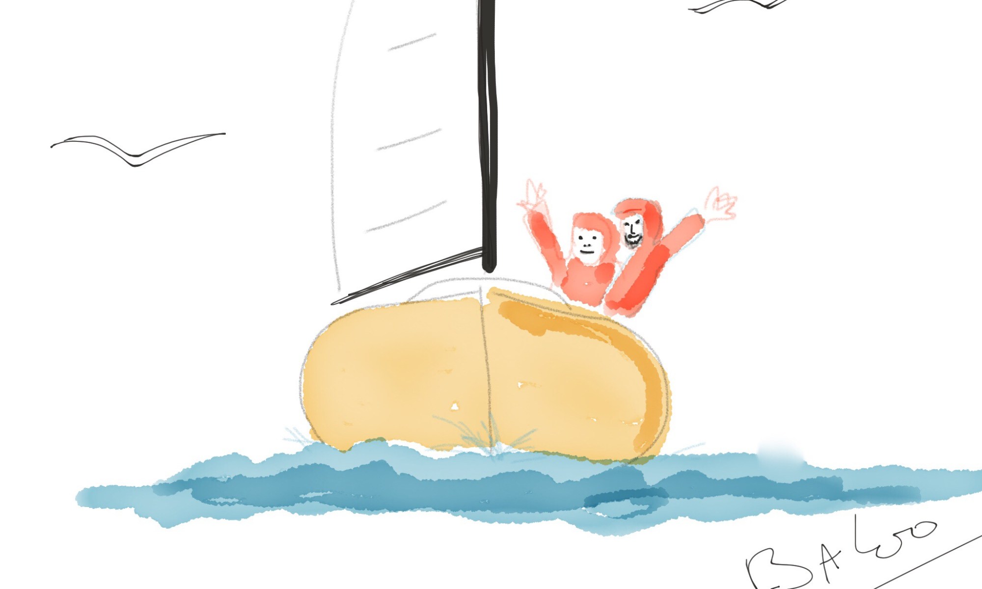 Le bateau Dessin « Omer et son équipage » © Sébastien Sill dit Baloo Le voilier : « Omer », un first 30 datant de 1979 L’équipage : Laurence et Hugues de Rosière